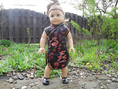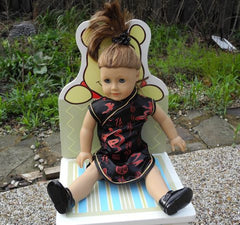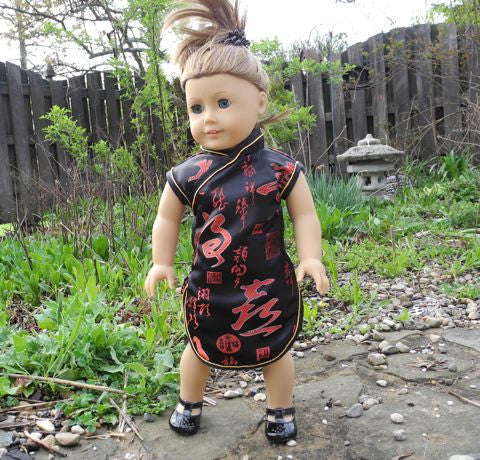Traditional Chinese style Qi pao dress for your American Girl Doll. The Qi pao (Chee pow) dress was worn in China from the 1920’s to the 1950’ as everyday style. It is still worn in China today for special events, parties, and weddings. Imagine your doll attending a Chinese new year’s party or dressing up for other Asian holidays or visiting her friend Ivy in her Qi pao. Each dress has zippers which makes dressing your American Girl doll easy. Dresses are finely detailed and hand made in beautiful traditional Chinese silk brocade in black, and gold.