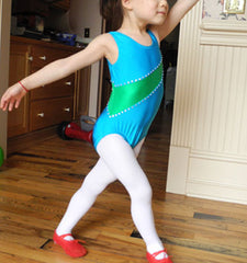This beautiful light blue green gymnastics leotard is perfect for gymnastics, Dance or swim. Size show in photographs is (children's size 5). Child Sizes: 2,3, 4, 5, 6, 7, 8 are available. Write the size you would like in the note section when you check out.